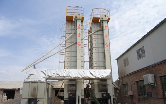 2臺(tái)東方紅5H-15循環(huán)式糧食烘干機(jī)正在進(jìn)行烘干作業(yè)